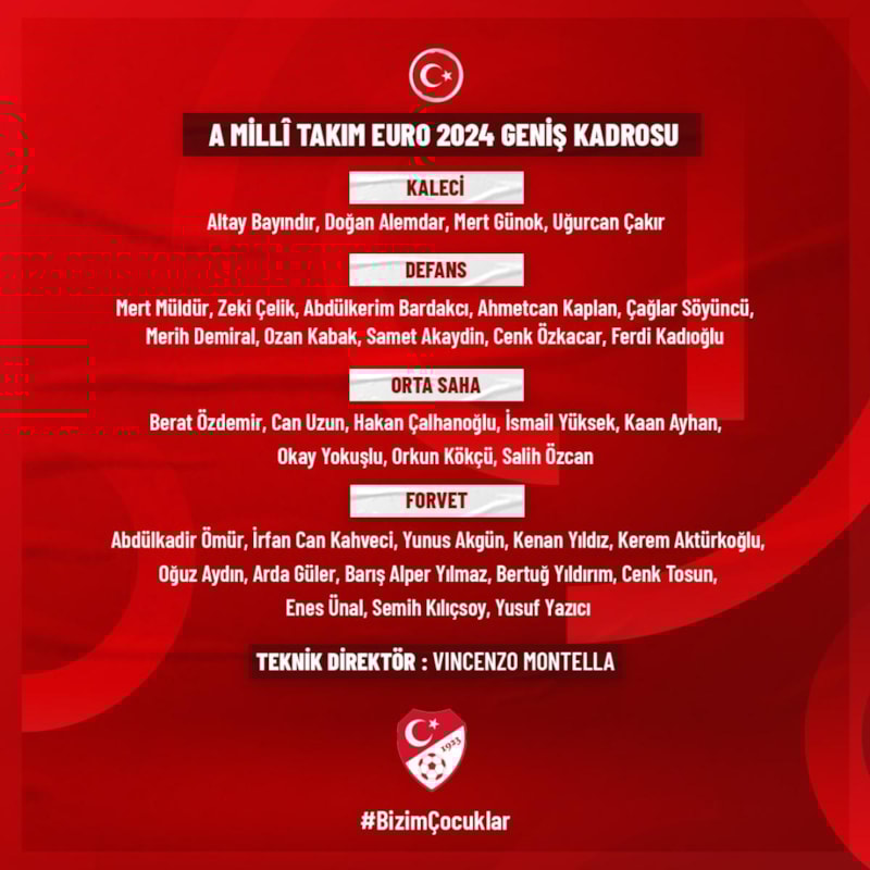 Almanya'nın ev sahipliğinde 14 Haziran - 14 Temmuz tarihleri arasında düzenlenecek 2024 Avrupa Şampiyonası (EURO 2024) finallerine katılacak A Milli Takımımızın geniş kadrosu açıklandı. Teknik Direktörümüz Vincenzo Montella tarafından belirlenen listede 35 futbolcu bulunuyor.