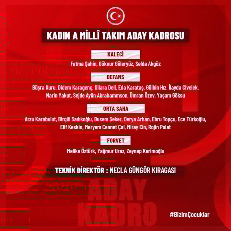 A Milli Kadın Futbol Takımı Teknik Direktörü Necla Güngör Kıragası tarafından Yunanistan ve Romanya maçları için belirlenen aday kadroda şu futbolcular yer alıyor:
