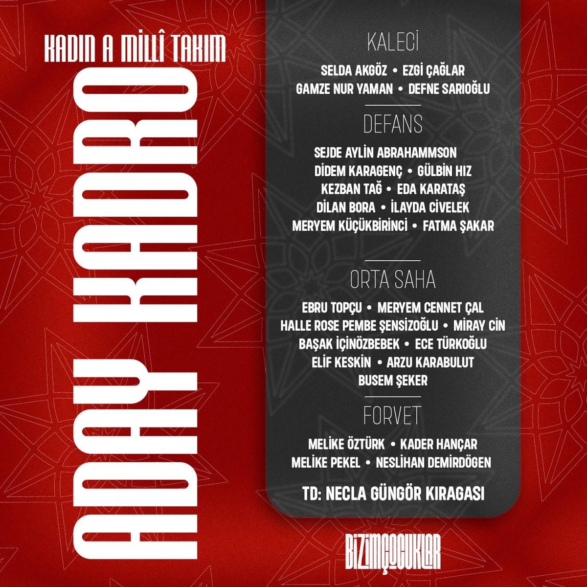 Türkiye Futbol Federasyonu'ndan yapılan açıklamaya göre, teknik direktör Necla Güngör Kıragası yönetimindeki ay-yıldızlıların kadrosunda 26 isim yer aldı.