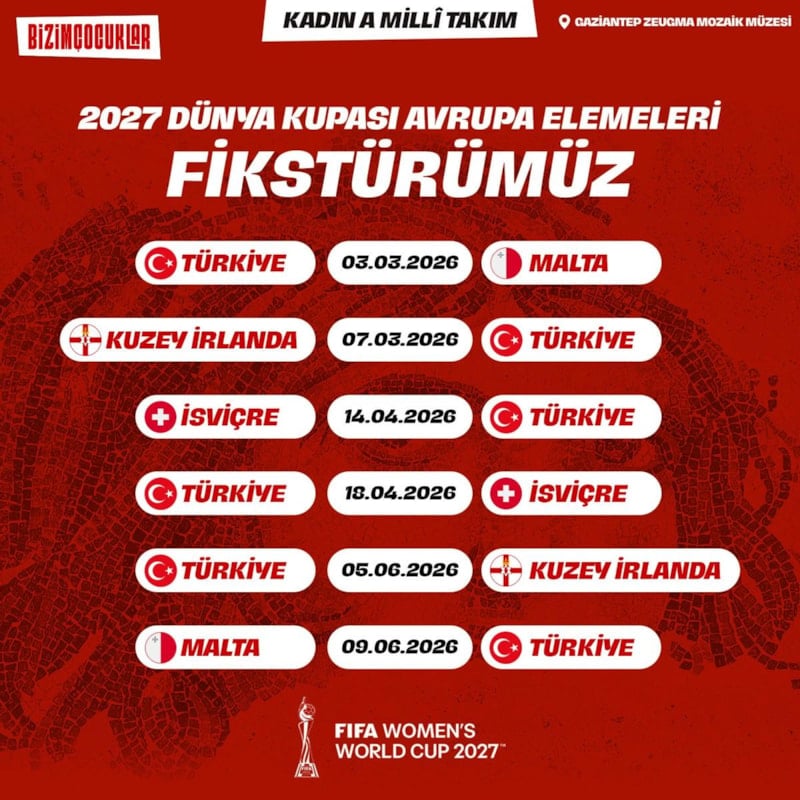 2027 FIFA Kadınlar Dünya Kupası Avrupa Elemeleri B Ligi 2. Grup'ta İsviçre, Kuzey İrlanda ve Malta ile eşleşen A Milli Kadın Futbol Takımı, ilk maçında 3 Mart 2026'da Malta'yı ağırlayacak.