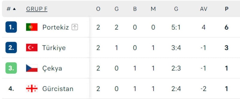 A Milli Futbol Takımı'nın Çekya'ya mağlup olması durumunda grup sonuncusu olma ihtimali de yer alıyor. Gürcistan'ın bir futbol mucizesi gerçekleştirip Portekiz'i mağlup etmesi halinde Bizim Çocuklar'ın EURO 2024 yolculuğu grup aşamasında bitecek.