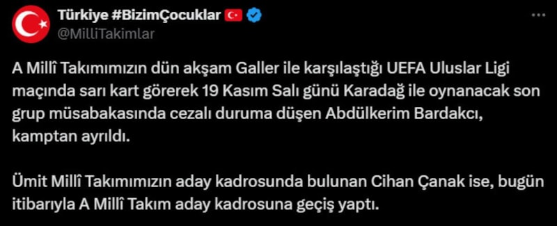 Türkiye Futbol Federasyonu, Galler maçında sarı kart gören ve Karadağ mücadelesi için cezalı duruma düşen Abdülkerim Bardakcı'nın kamptan ayrıldığını, Cihan Çanak'ın ise A Milli Takım aday kadrosuna geçiş yaptığını duyurdu.