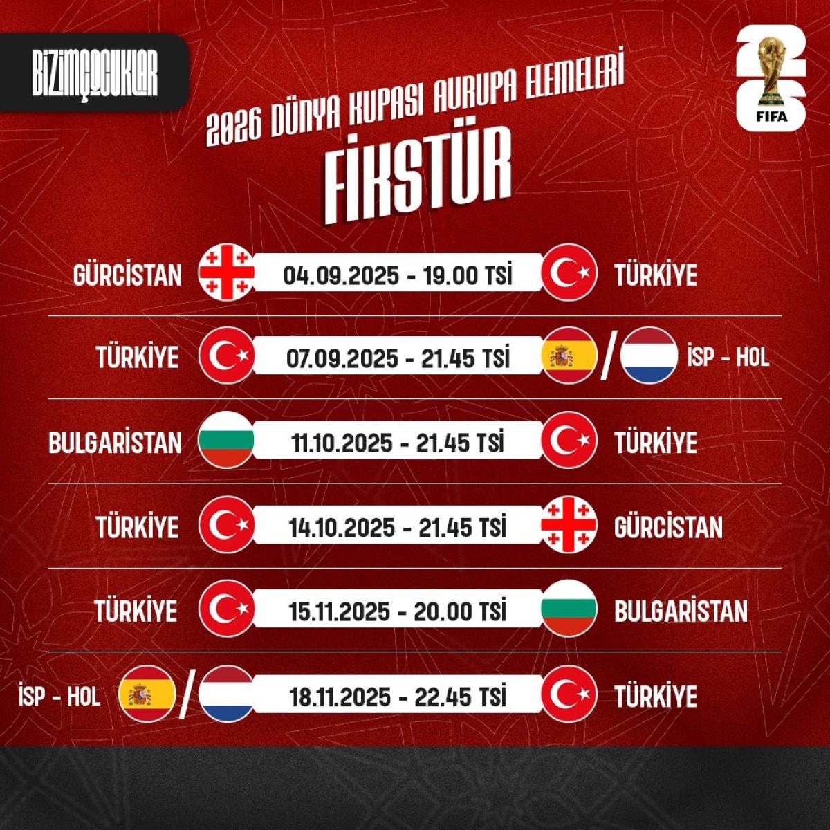 A Milli Futbol Takımı'nın elemelerdeki maç fikstürü şöyle: