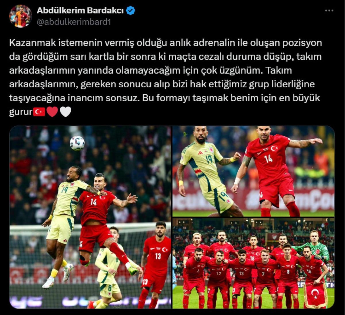 Kazanmak istemenin vermiş olduğu anlık adrenalin ile oluşan pozisyonda gördüğüm sarı kartla bir sonraki maçta cezalı duruma düşüp, takım arkadaşlarımın yanında olamayacağım için çok üzgünüm. Takım arkadaşlarımın, gereken sonucu alıp bizi hak ettiğimiz grup liderliğine taşıyacağına inancım sonsuz. Bu formayı taşımak benim için en büyük gurur.