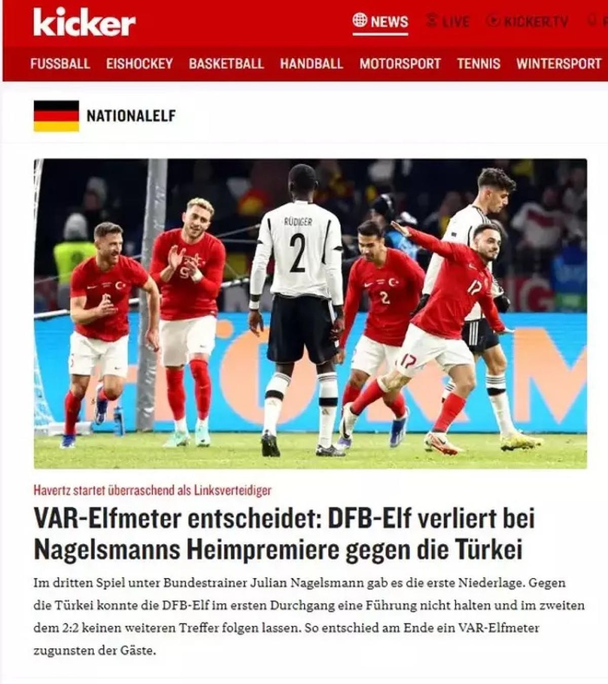 Kicker'da yer alan habere göre ise Julian Nagelsmann'ın ilk yenilgisini Türkiye karşısında aldığı belirtilirken VAR kararıyla verilen penaltıya da atıfta bulunuldu: