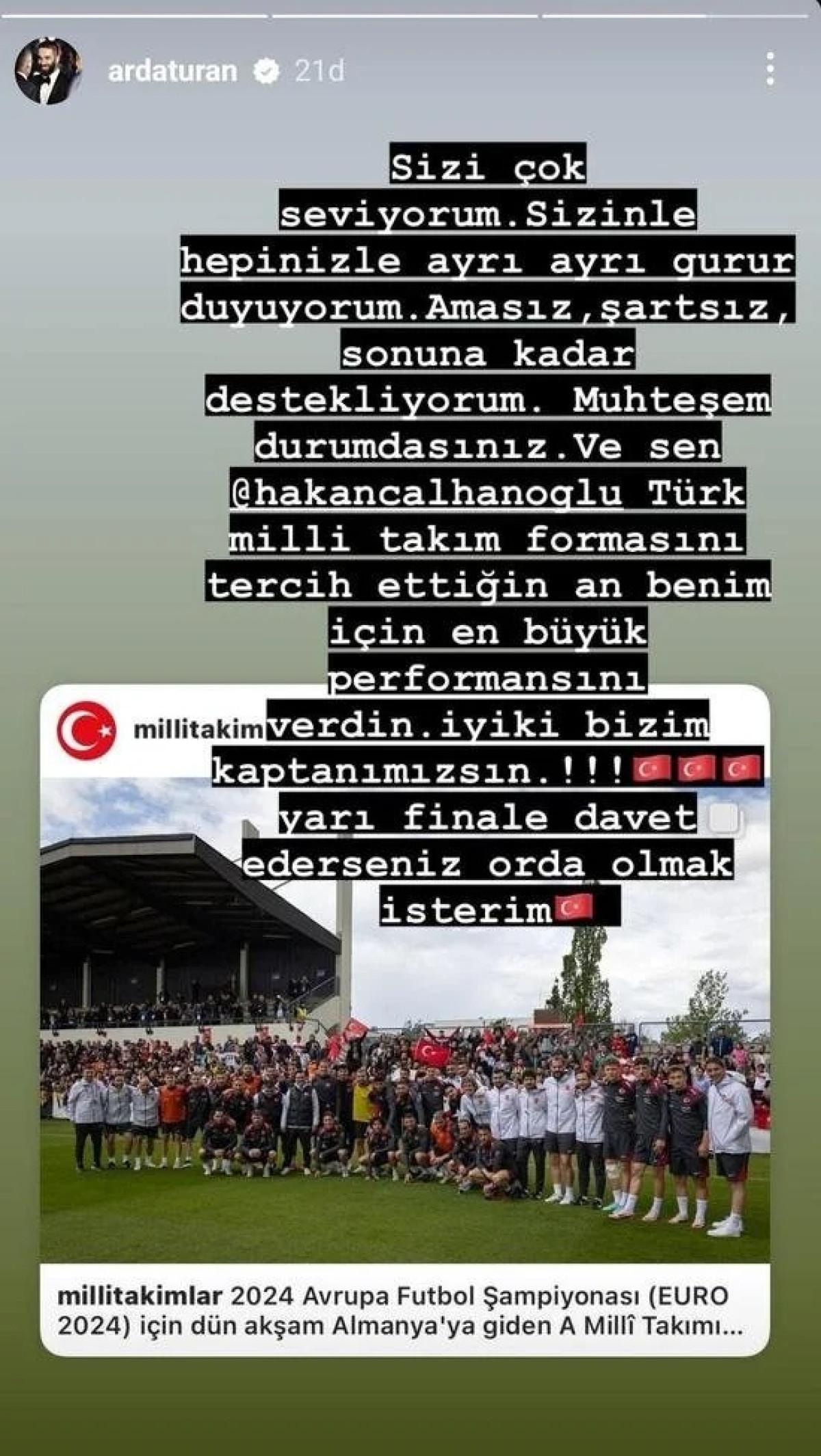 Sizi çok seviyorum. Sizinle, hepinizle ayrı ayrı gurur duyuyorum. Amasız, şartsız, sonuna kadar destekliyorum. Muhteşem durumdasınız. Ve sen Hakan Çalhanoğlu, Türk milli takım formasını tercih ettiği an benim için en büyük performansını verdin. İyi ki bizim kaptanımızsın! Yarı finale davet ederseniz orada olmak isterim.