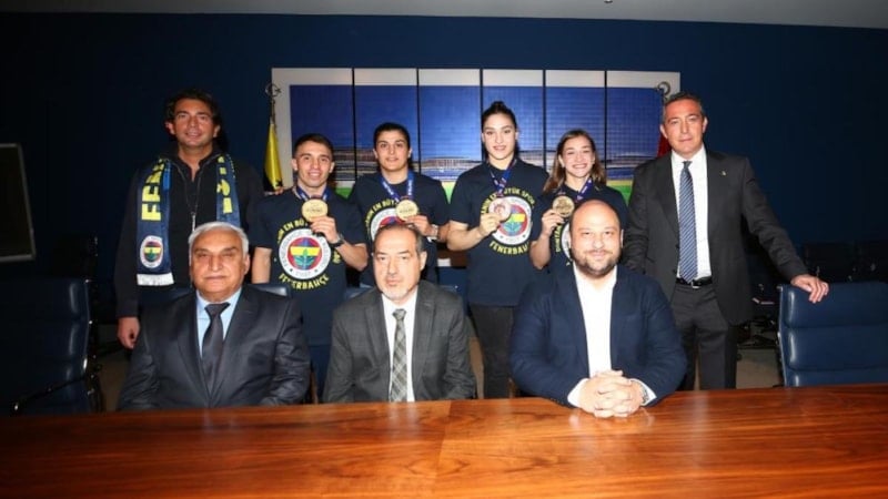 Avrupa Şampiyonası'nda 3 altın ve 1 bronz madalya kazanan Fenerbahçeli boksörler Buse Naz Çakıroğlu, Busenaz Sürmeneli, Samet Gümüş ve Büşra Işıldar, kulüp başkanı Ali Koç'la bir araya geldi.