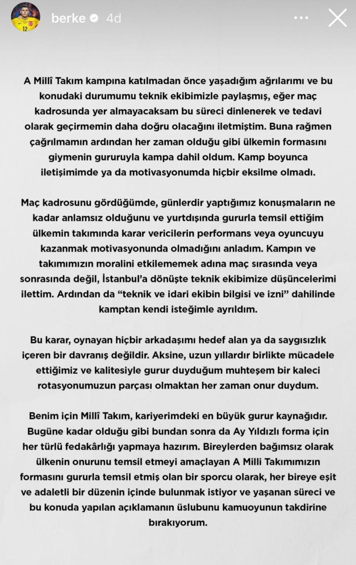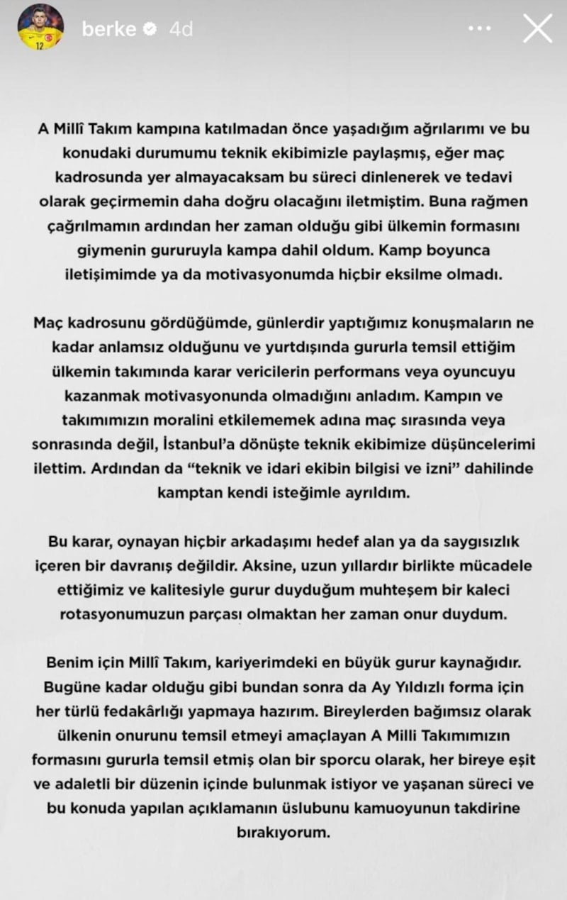 A Milli Takım kampına katılmadan önce yaşadığım ağrılarımı ve bu konudaki durumumu teknik ekibimizle paylaşmış, eğer maç kadrosunda yer almayacaksam bu süreci dinlenerek ve tedavi olarak geçirmemin daha doğru olacağını iletmiştim. Buna rağmen çağrılmamın ardından her zaman olduğu gibi ülkemin formasını giymenin gururuyla kampa dahil oldum. Kamp boyunca iletişimimde ya da motivasyonumda hiçbir eksilme olmadı.