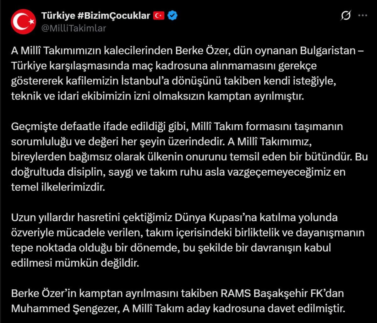 Geçmişte defaatle ifade edildiği gibi, milli takım formasını taşımanın sorumluluğu ve değeri her şeyin üzerindedir. A Milli Takımımız, bireylerden bağımsız olarak ülkenin onurunu temsil eden bir bütündür. Bu doğrultuda disiplin, saygı ve takım ruhu asla vazgeçemeyeceğimiz en temel ilkelerimizdir. Uzun yıllardır hasretini çektiğimiz Dünya Kupası'na katılma yolunda özveriyle mücadele verilen, takım içerisindeki birliktelik ve dayanışmanın tepe noktada olduğu bir dönemde bu şekilde bir davranışın kabul edilmesi mümkün değildir. Berke Özer'in kamptan ayrılmasını takiben RAMS Başakşehir FK'den Muhammed Şengezer, A Milli Takım aday kadrosuna davet edilmiştir.