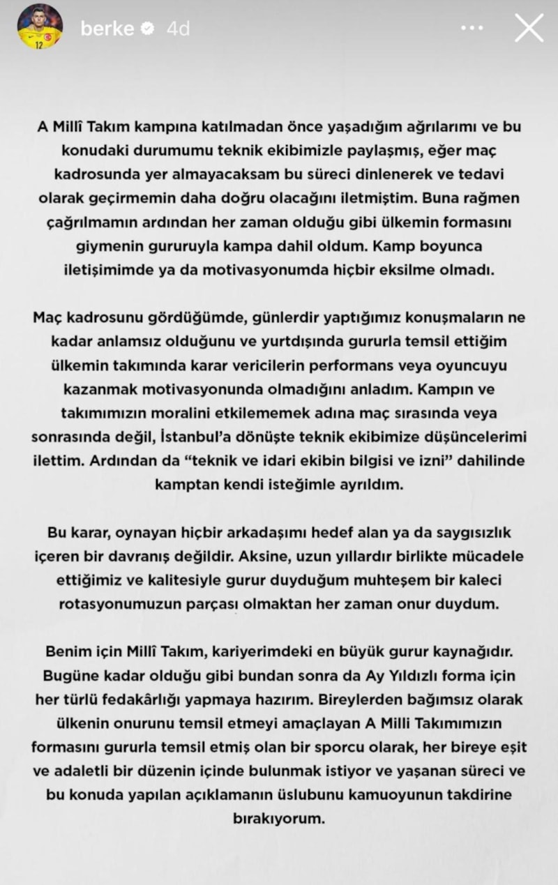 A Milli Takım kampına katılmadan önce yaşadığım ağrılarımı ve bu konudaki durumumu teknik ekibimizle paylaşmış, eğer maç kadrosunda yer almayacaksam bu süreci dinlenerek ve tedavi olarak geçirmemin daha doğru olacağını iletmiştim. Buna rağmen çağrılmamın ardından her zaman olduğu gibi ülkemin formasını giymenin gururuyla kampa dahil oldum. Kamp boyunca iletişimimde ya da motivasyonumda hiçbir eksilme olmadı. Maç kadrosunu gördüğümde, günlerdir yaptığımız konuşmaların ne kadar anlamsız olduğunu ve yurtdışında gururla temsil ettiğim ülkemin takımında karar vericilerin performans veya oyuncuyu kazanmak motivasyonunda olmadığını anladım. Kampın ve takımımızın moralini etkilememek adına maç sırasında veya sonrasında değil, İstanbul'a dönüşte teknik ekibimize düşüncelerimi ilettim. Ardından da "teknik ve idari ekibin bilgisi ve izni" dahilinde kamptan kendi isteğimle ayrıldım. Bu karar, oynayan hiçbir arkadaşımı hedef alan ya da saygısızlık içeren bir davranış değildir. Aksine, uzun yıllardır birlikte mücadele ettiğimiz ve kalitesiyle gurur duyduğum muhteşem bir kaleci rotasyonumuzun parçası olmaktan her zaman onur duydum. Benim için Milli Takım, kariyerimdeki en büyük gurur kaynağıdır. Bugüne kadar olduğu gibi bundan sonra da Ay Yıldızlı forma için her türlü fedakârlığı yapmaya hazırım. Bireylerden bağımsız olarak ülkenin onurunu temsil etmeyi amaçlayan A Milli Takımımızın formasını gururla temsil etmiş olan bir sporcu olarak, her bireye eşit ve adaletli bir düzenin içinde bulunmak istiyor ve yaşanan süreci ve bu konuda yapılan açıklamanın üslubunu kamuoyunun takdirine bırakıyorum.