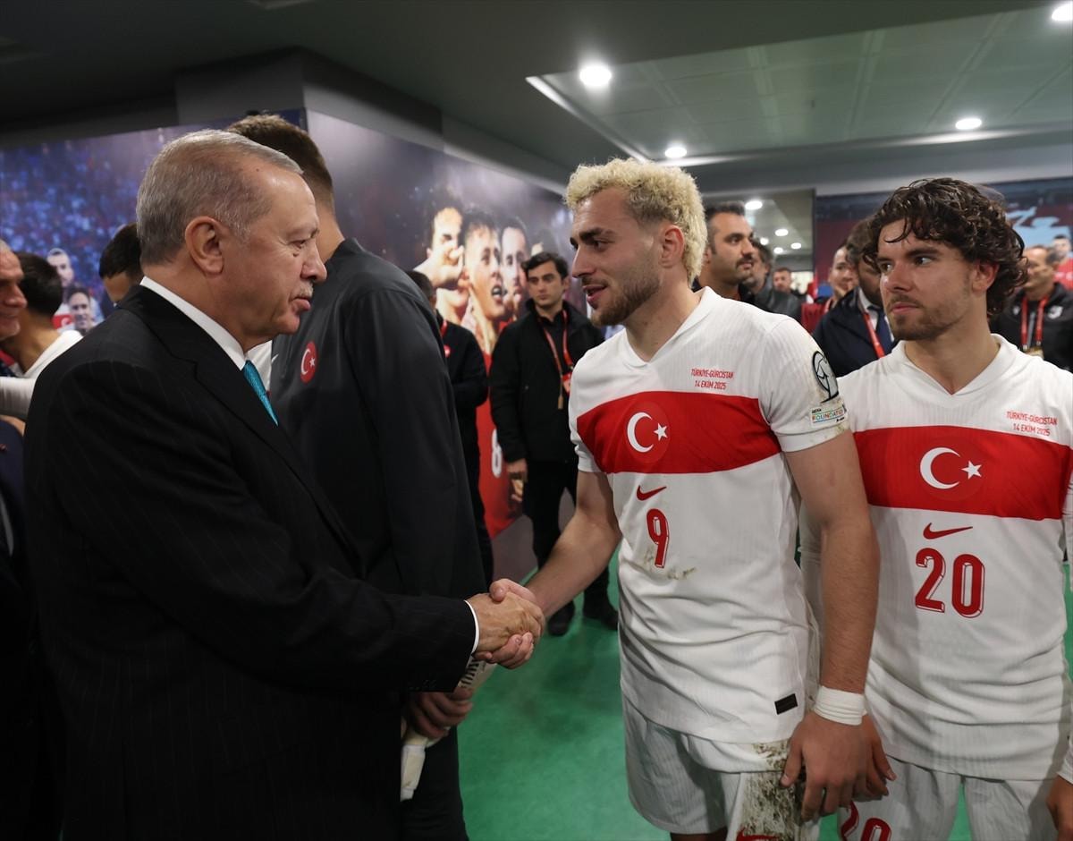 Cumhurbaşkanı Erdoğan, maç bitiminde Gürcistan'ı farklı yenen A Milli Futbol Takımı'nı tek tek tebrik ederek el sıkıştı.