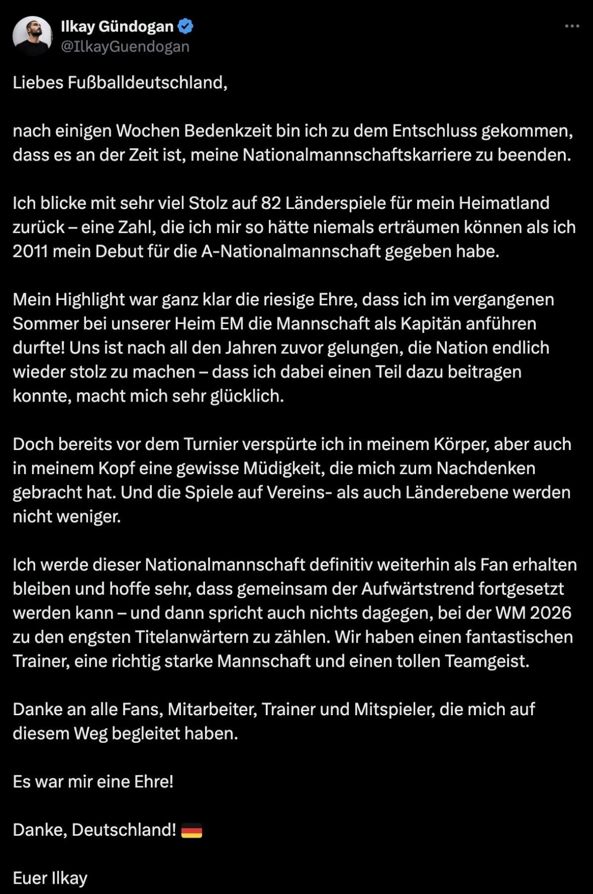 Son olarak 2024 Avrupa Futbol Şampiyonası'nda kaptan olarak görev yapan İlkay, Almanya Milli Takımı'nda 82 kez forma giydi.