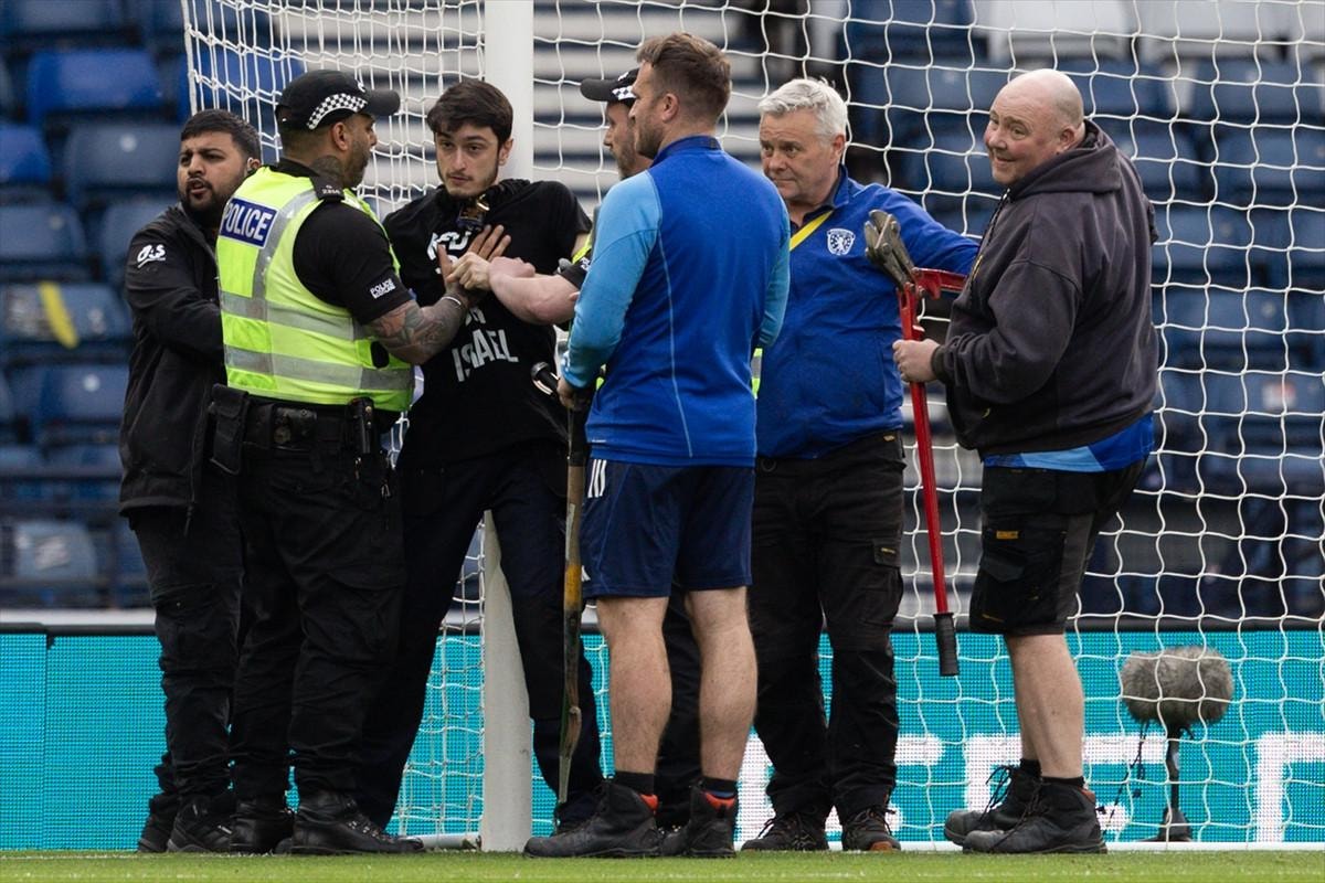İskoçya'nın Glasgow kentindeki Hampden Park'ta dün oynanan karşılaşma öncesi Filistin destekçisi bir kişi, "İsrail'e kırmızı kart" yazılı tişörtle sahaya girdi.