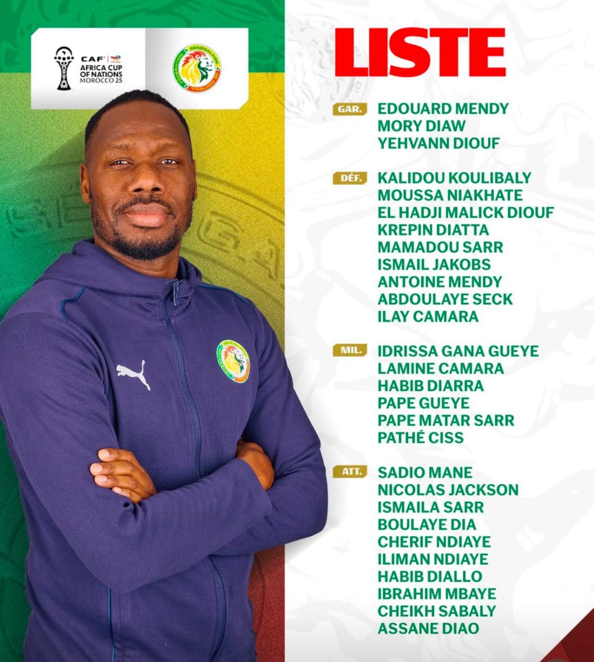 - Senegal Milli Takımı'nın Afrika Uluslar Kupası kadrosunda Galatasaraylı Ismail Jakobs ve Samsunsporlu Cherif Ndiaye yer aldı.