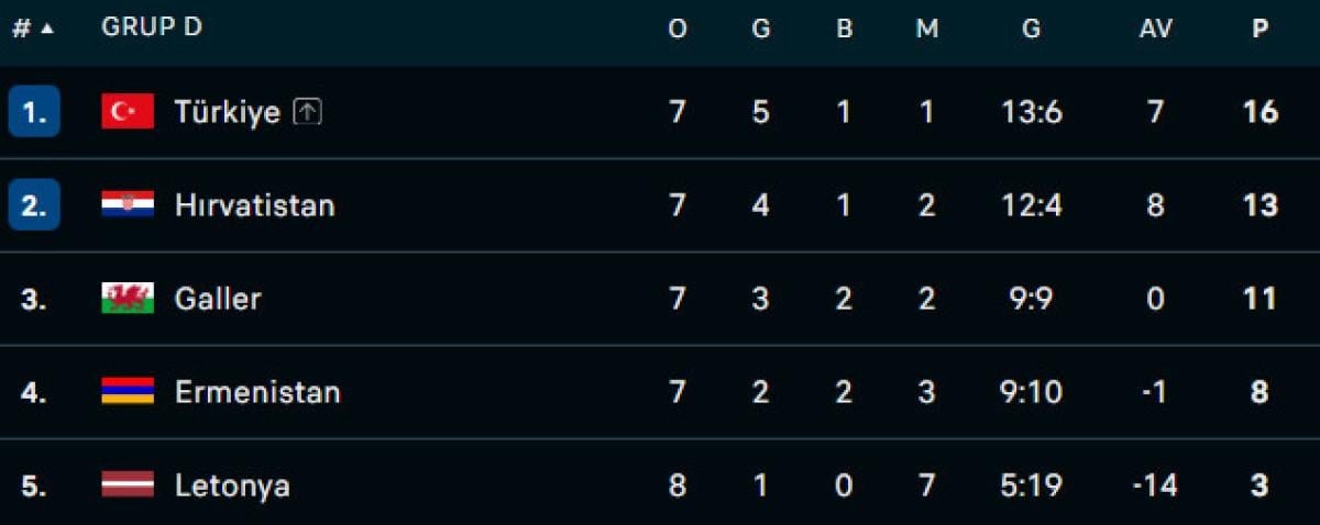Grupta günün diğer maçındaysa Ermenistan'la deplasmanda 1-1 berabere kalan Galler liderlik şansını kaybederken gruptan çıkma hayallerini de zora soktu.