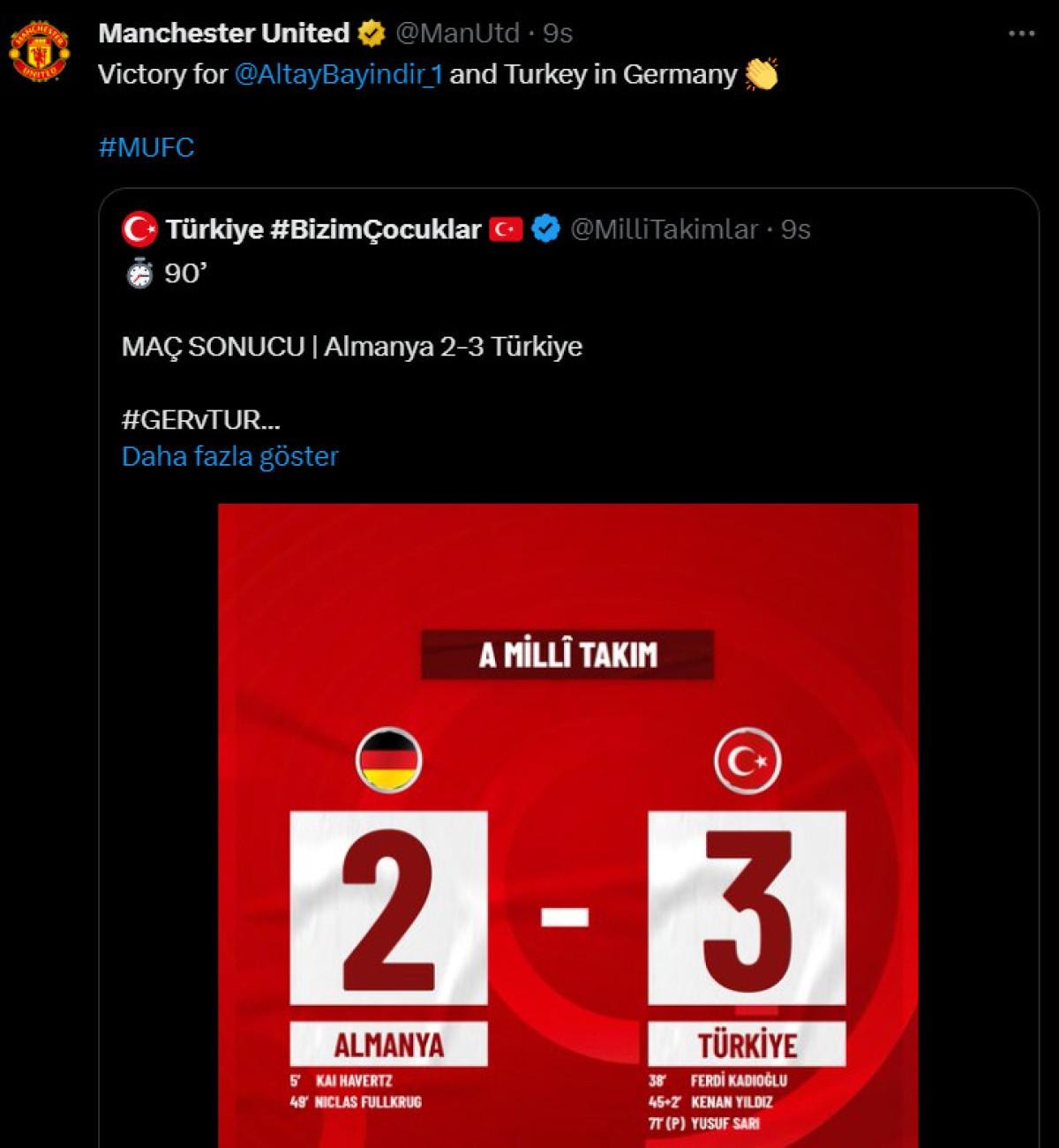 Bu müsabakanın ardından İngiltere Premier Lig ekibi Manchester United'dan Altay Bayındır ve Türkiye paylaşımı geldi.