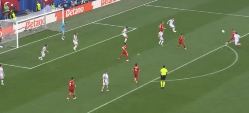 Ceza sahası ön çizgisinin birkaç adım sağ çaprazda önünde bulunan Mert Müldür sağ ayağıyla gelişine sert vurdu, top yakın mesafeden 90'a gitti.