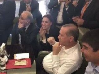 Karşılaşmayı Amerika yolunda izleyen Cumhurbaşkanı Recep Tayyip Erdoğan, Hakan Çalhanoğlu'nun seyirlik frikik golünde kafiledekilerle birlikte sevinç yaşadı.