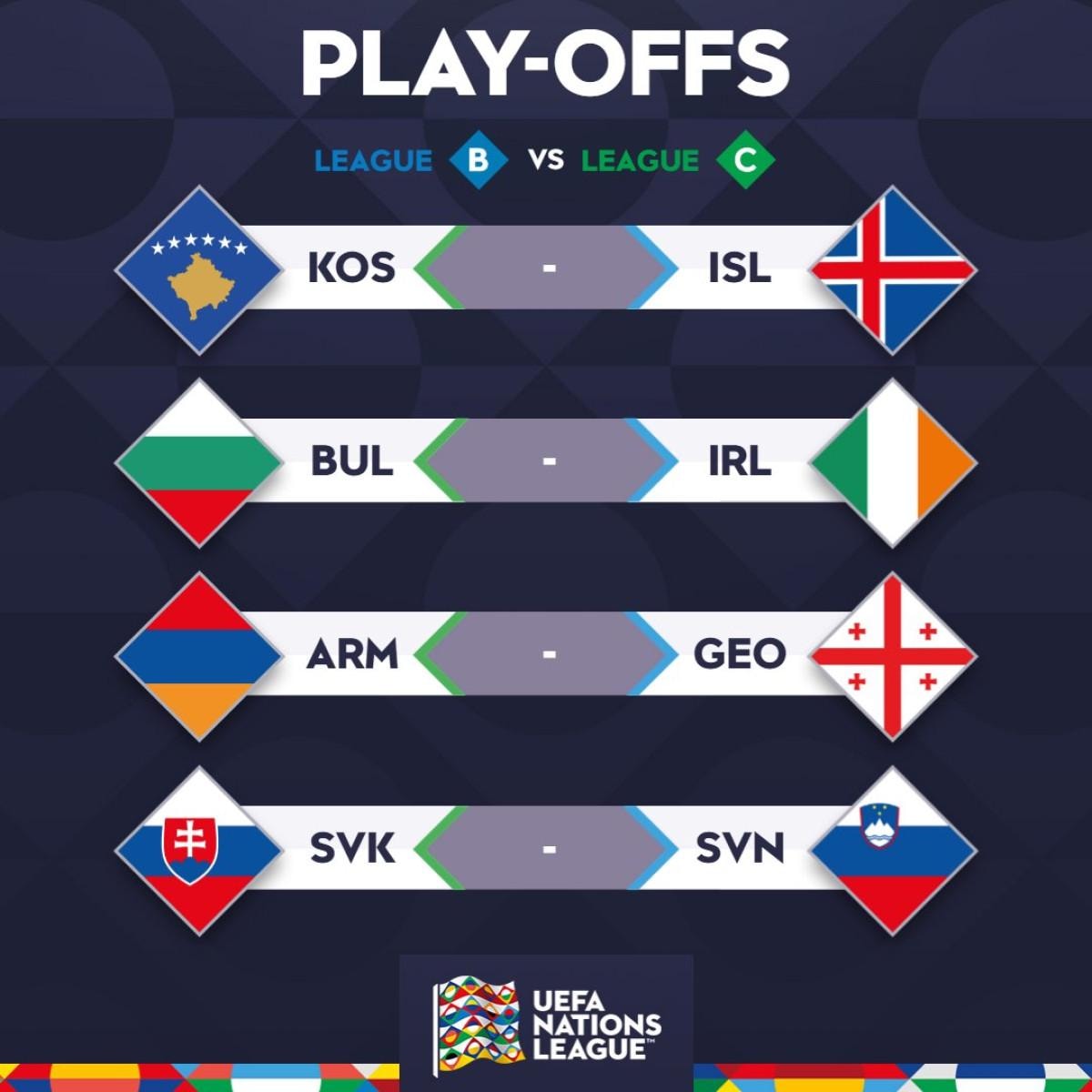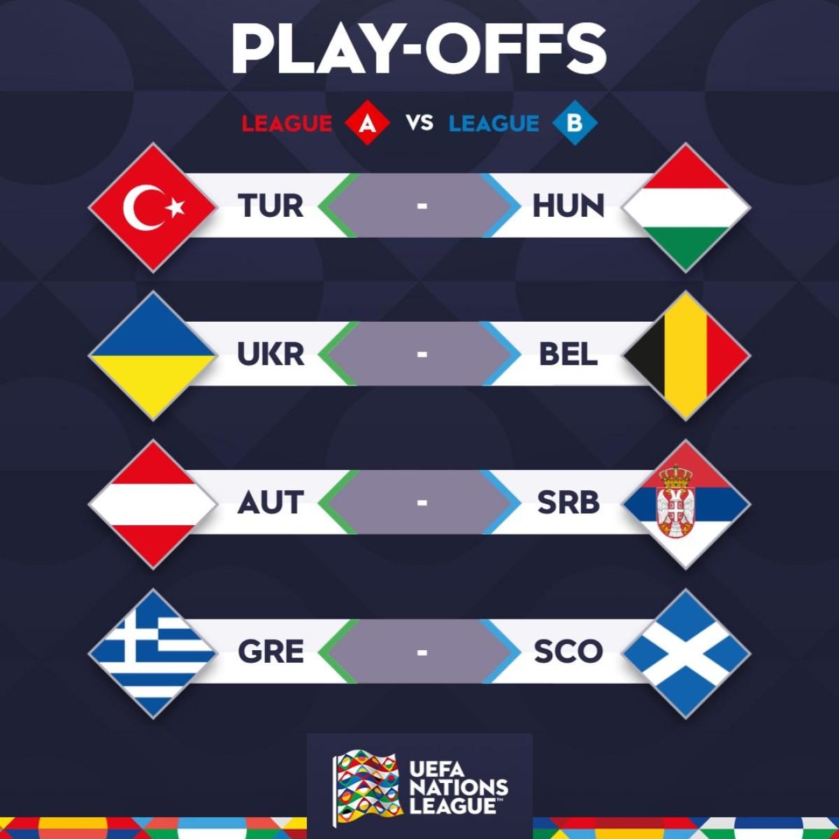 UEFA Uluslar Ligi'nde gruptan bir üst lige çıkan veya düşen son takımları belirleyecak play-off aşaması kura çekimi, İsviçre'nin Nyon kentindeki UEFA merkezinde gerçekleştirildi.