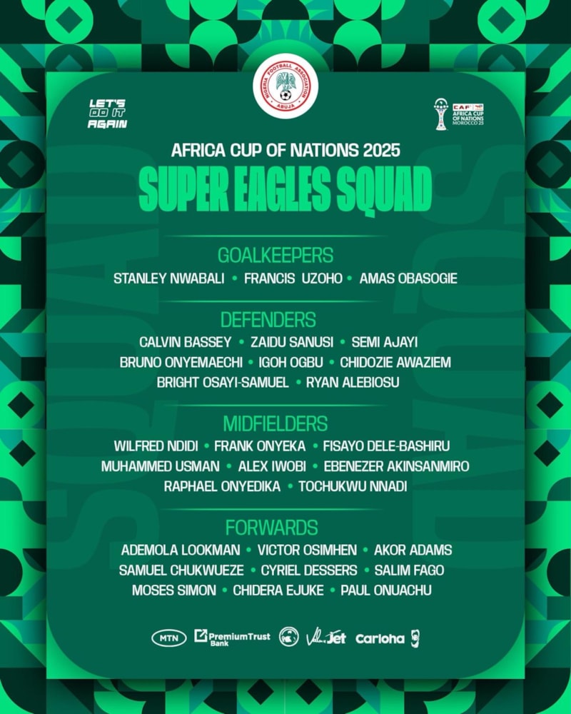 Nijerya Futbol Federasyonu'nun açıklamasına göre teknik direktör Eric Chelle, 21 Aralık-18 Ocak tarihlerindeki turnuva öncesi 28 kişilik kadroyu belirledi.