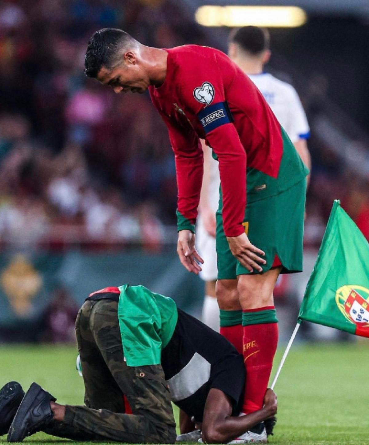 Mücadelenin bitmesiyle birlikte sahaya atlayan bir taraftar, yıldız futbolcu Cristiano Ronaldo'nun ayaklarına kapandı.