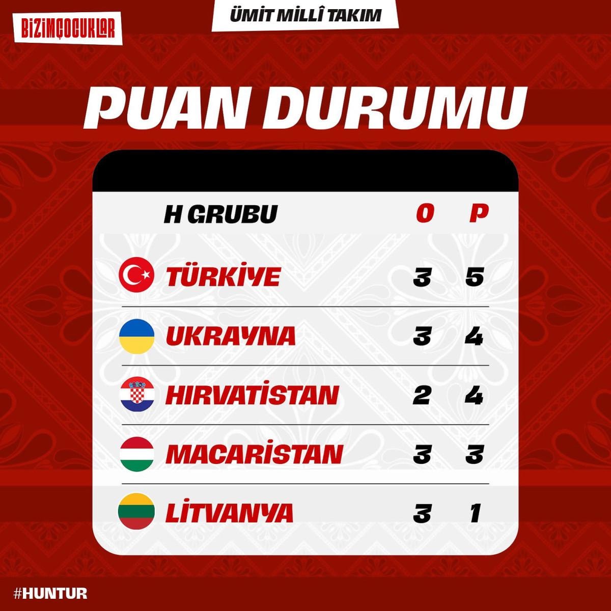 Bu sonuçla birlikte Ümit Milli Takımımız, gruptaki puanını 5'e çıkarttı ve maç fazlasıyla liderlik koltuğunda yer aldı. Macaristan ise 3 puan ile sondan ikinci oldu.
