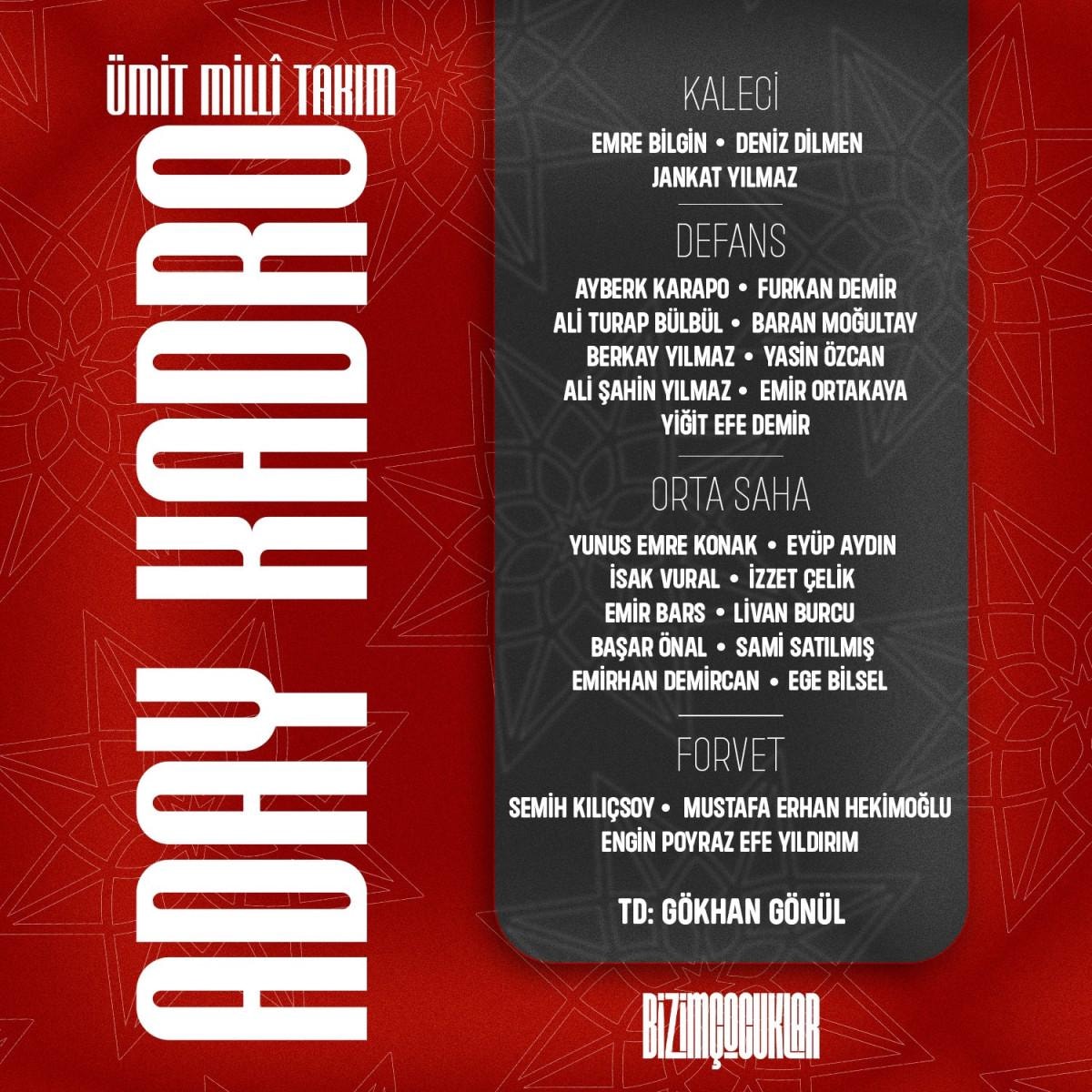 Defans: Ayberk Karapo (Rizespor), Furkan Demir (TSV Hartberg), Ali Turap Bülbül (Ümraniyespor), Baran Moğultay (Borussia Dortmund II), Berkay Yılmaz (Nürnberg), Yasin Özcan (Kasımpaşa), Ali Şahin Yılmaz (Trabzonspor), Emir Ortakaya (Beerschot), Yiğit Efe Demir (Fatih Karagümrük)