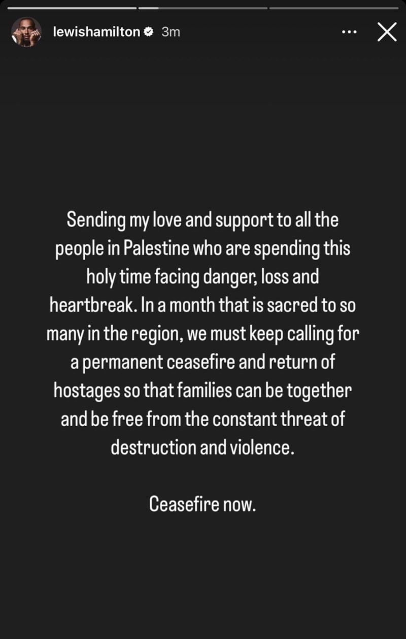 Formula 1 pilotu Lewis Hamilton, sosyal medya hesabından Gazze'de yaşanan olaylarla ilgili ateşkes çağrısı yaptı.