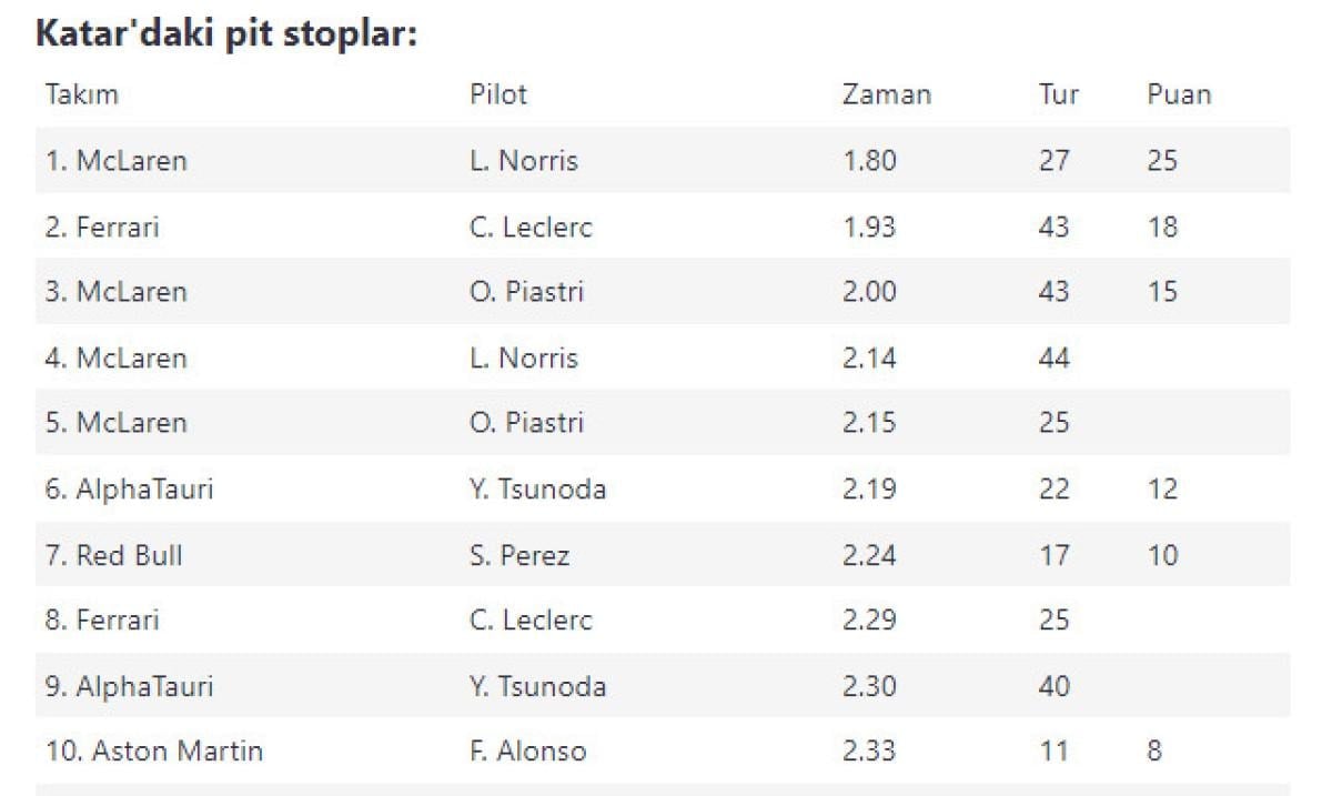 Katar'da McLaren mekanikerleri, Lando Norris'in lastiklerini 1,80 saniyede değiştirerek sezonun en hızlı pit stopuna imza attı.