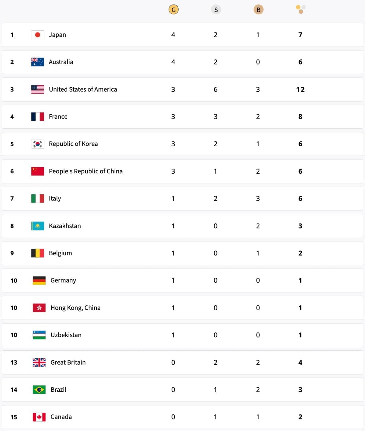 Eskrimde 1 altın, judoda 2 altın ve 1 bronz, kaykayda 1 altın ve 1 gümüş, yüzmede de 1 gümüş madalya kazanan Japonya, toplamda 4 altın, 2 gümüş ve 1 bronzla ülkeler sıralamasında en üst basamağa yükseldi.