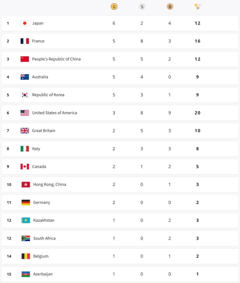 Oyunların ikinci gününü dördüncü sırada tamamlayan ev sahibi Fransa ise 5 altın, 8 gümüş ve 3 bronz madalyayla ikinci sıraya yerleşti.