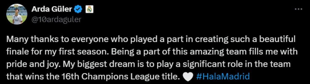 19 yaşındaki milli futbolcu Arda, kazandığı Şampiyonlar Ligi'nin ardından sosyal meyda hesabından bir paylaşımda bulundu.
