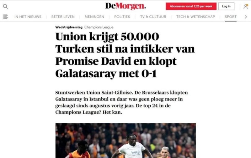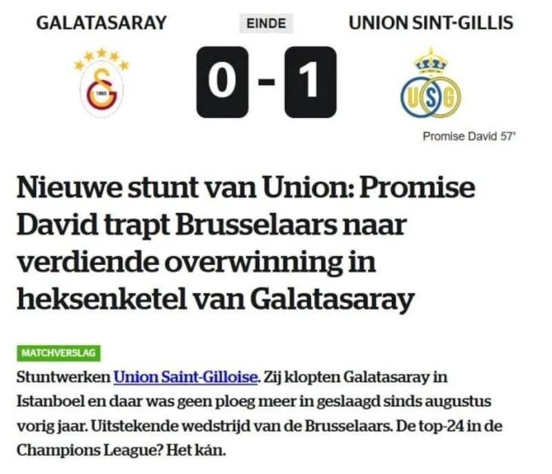 Belçika basınından De Morgen, Union Saint-Gilloise'nın Galatasaray'ı 1-0 yendiği maçın ardından "Union SG, Promise David'in golüyle 50.000 Türk'ü susturdu" ifadelerini kullandı.