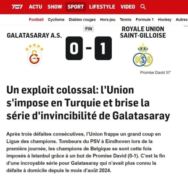 7sur7: Devasa bir başarı! Union, Türkiye'de zafer kazandı ve Galatasaray'ın yenilmezlik serisini sonlandırdı. Üst üste üç yenilginin ardından, Union Saint-Gilloise Şampiyonlar Ligi'nde güçlü bir çıkış yakaladı. İstanbul'da Promise David'in golüyle (1-0) bir galibiyet daha elde etti. Bu, Ağustos 2024'ten beri evinde kaybetmeyen Galatasaray için inanılmaz bir serinin sonu oldu.