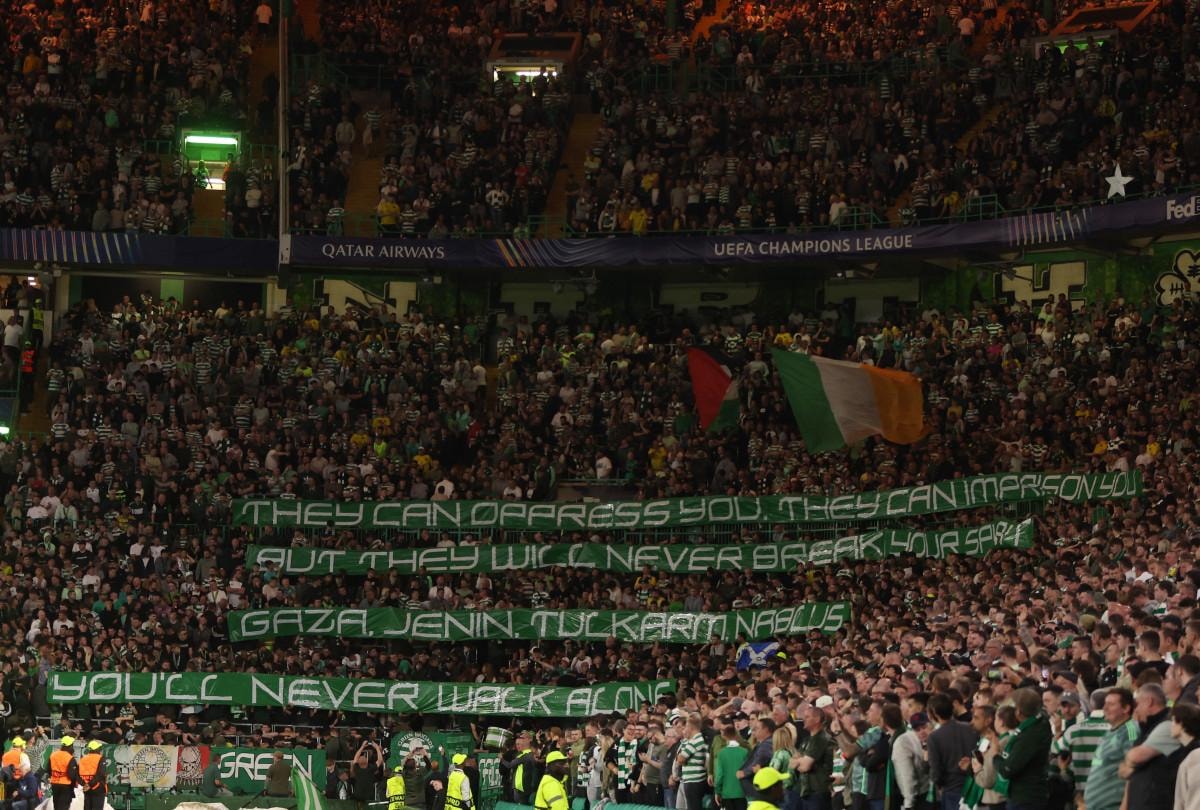 "Yeşil Tugay" (Green Brigade) grubuna üye Celtic taraftarları, müsabaka sırasında tribünde "Size zulmedebilirler, sizi hapsedebilirler ama asla cesaretinizi kıramazlar. Gazze, Cenin, Tulkarm, Nablus, asla yalnız yürümeyeceksiniz." yazılı pankarta yer verdi.
