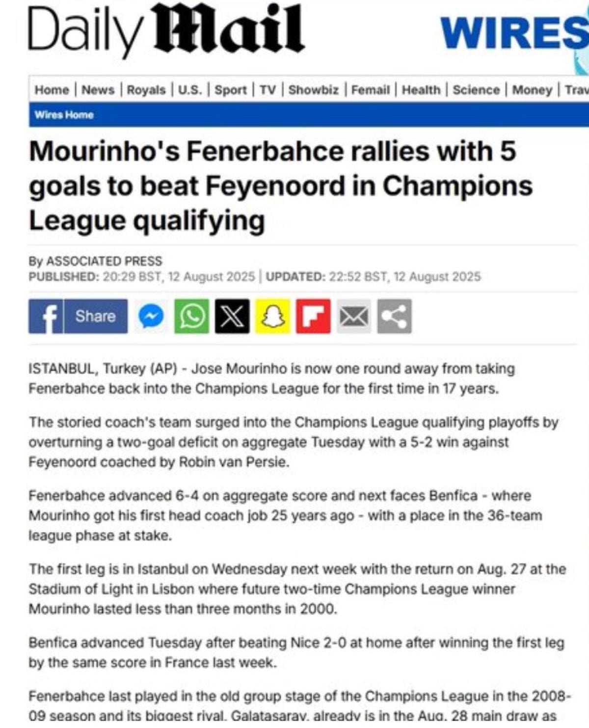 Mourinho'nun Fenerbahçe'si, Şampiyonlar Ligi elemelerinde 5 gollü galibiyetle toparlandı ve Feyenoord'u saf dışı bıraktı.