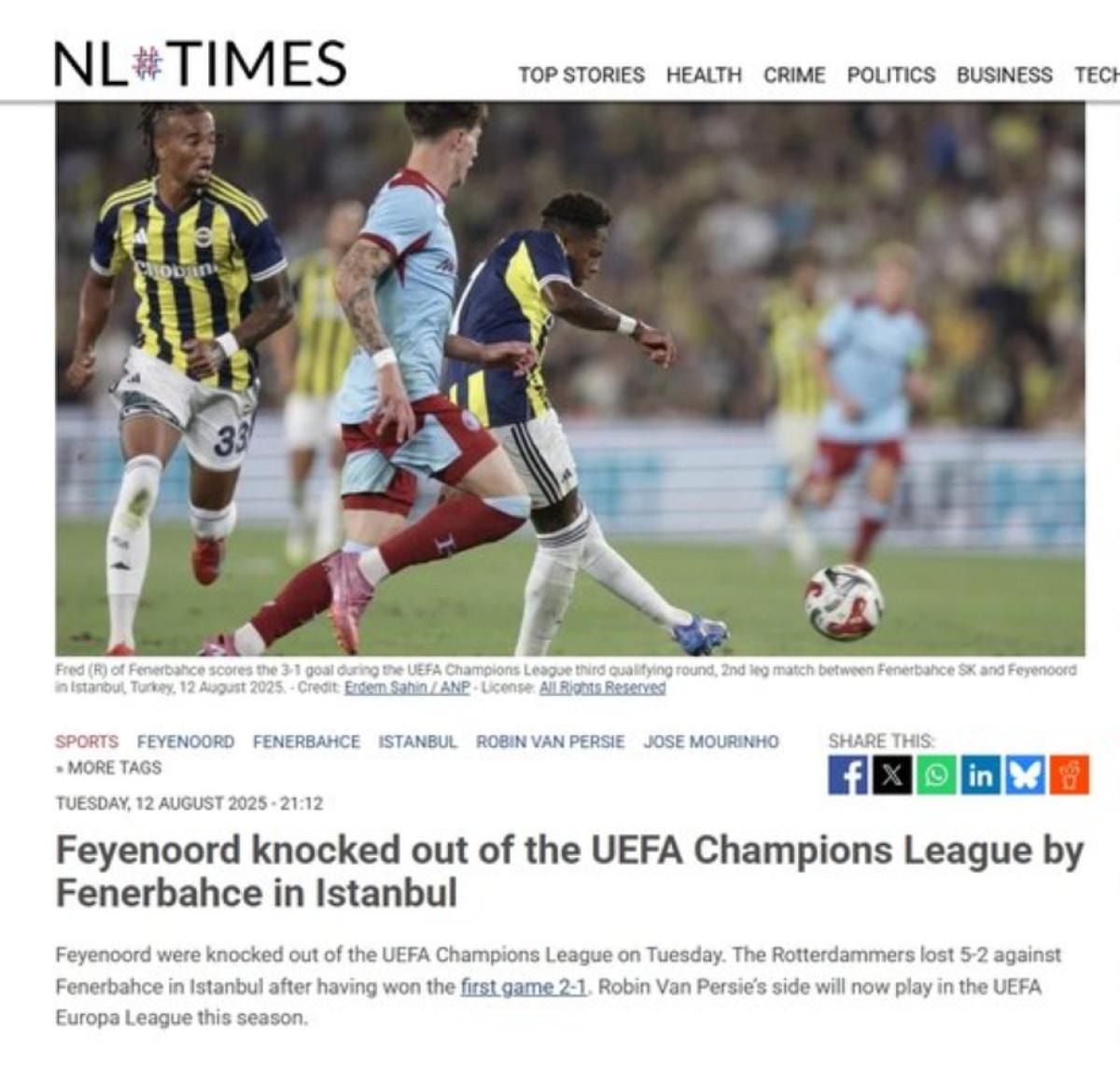 Fenerbahçe, Feyenoord'u eledi ve Benfica'nın play-off'ta rakibi oldu. Futboluyla dikkat çeken Türk ekibi 2-1'lik yenilgiden 5-2'lik galibiyetle döndü ve tur atladı.
