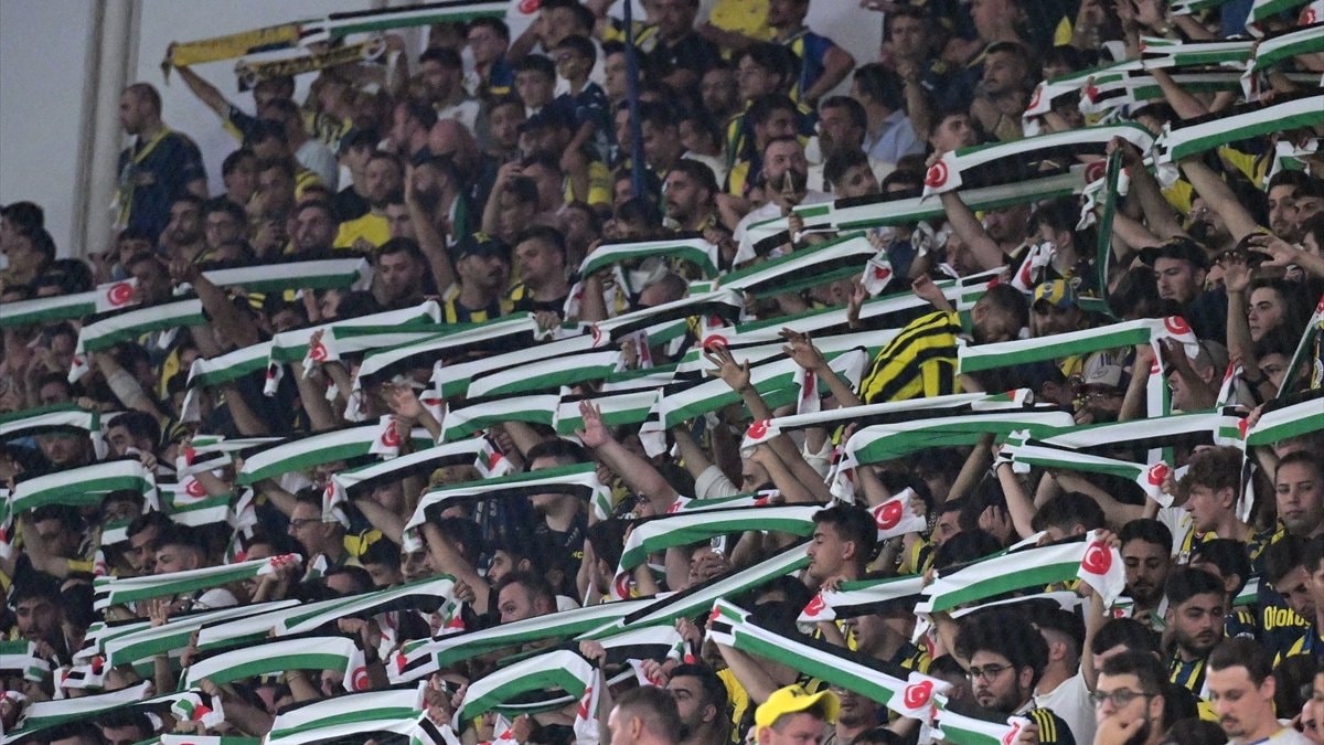 İki takımın futbolcularının seremoniye çıkmasıyla çıkmasıyla birlikte Şükrü Saraçoğlu Spor Kompleksi Okul Açık Tribünü'nde Gazze için çağrı mesajı paylaşıldı.
