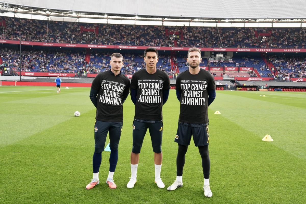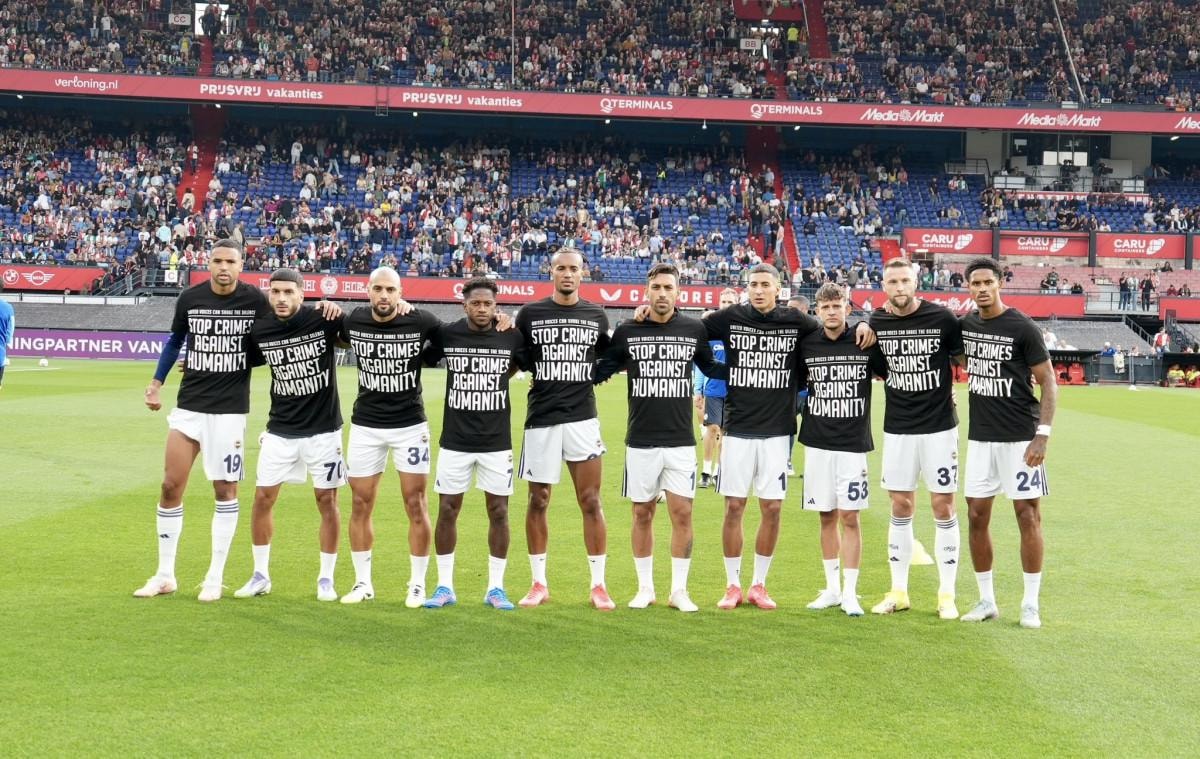 Fenerbahçeli futbolcular, Feyenoord maçı öncesinde ısınmaya Gazze'ye destek tişörtleriyle çıktı.