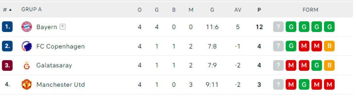 İkinci sırada bulunan Kopenhag ve temsilcimiz Galatasaray'ın 4'er puanı bulunuyor. Manchester United ise 3 puanla grupta son sırada yer alıyor.