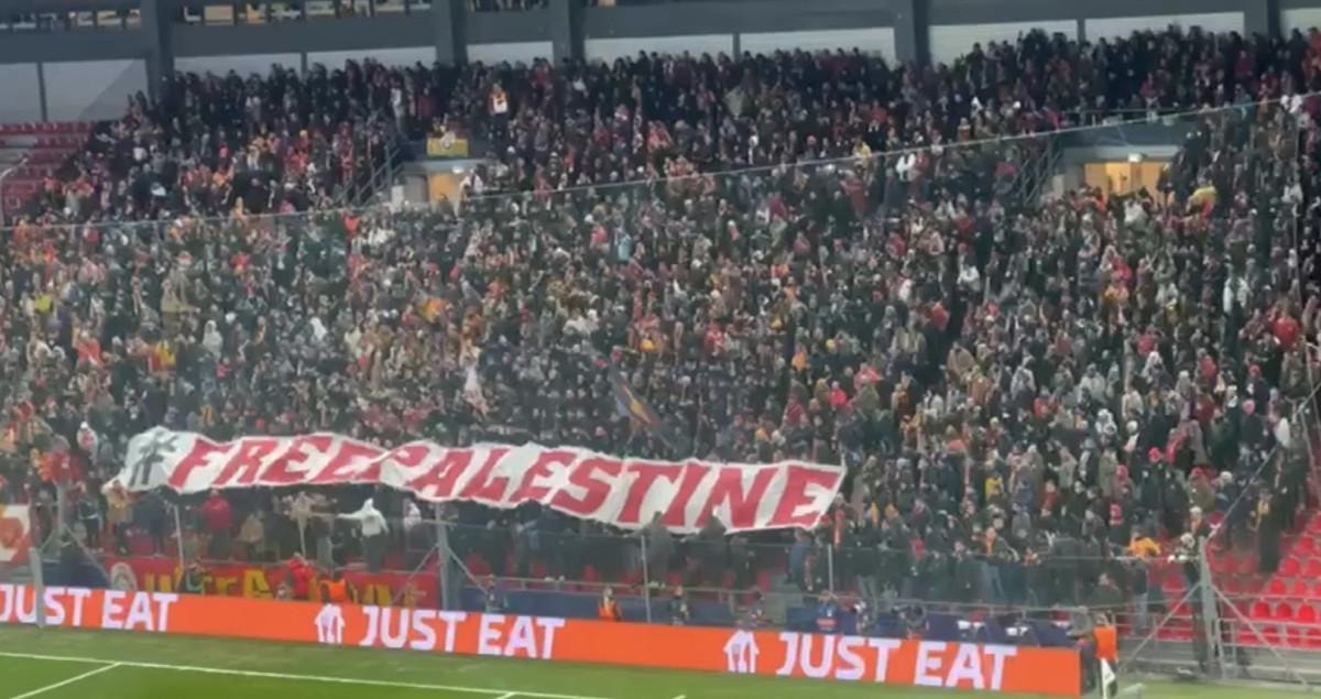 Galatasaraylı taraftarlar, tribünde üzerinde İngilizce "Özgür Filistin" yazısının bulunduğu pankartı açarak, Filistin'e destek verdi.
