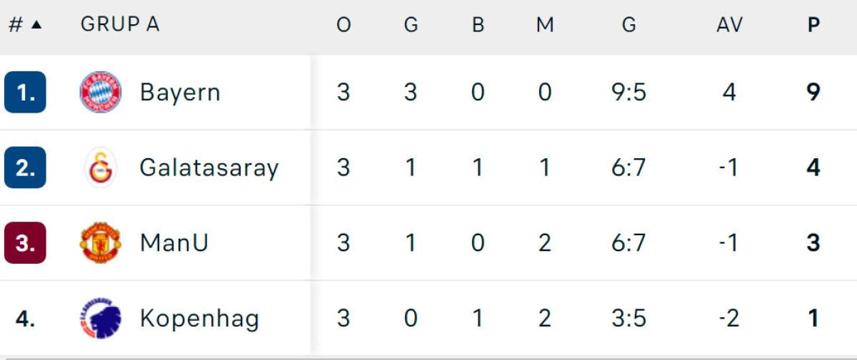 A grubunda temsilcimiz Galatasaray, sahasında Almanya Bundesliga ekibi Bayern Münih’e 3-1 mağlup olurken, grubun diğer maçında İngiliz ekibi Manchester United sahasında Danimarka temsilcisi Kopenhag’ı 1-0’lık skorla yendi.