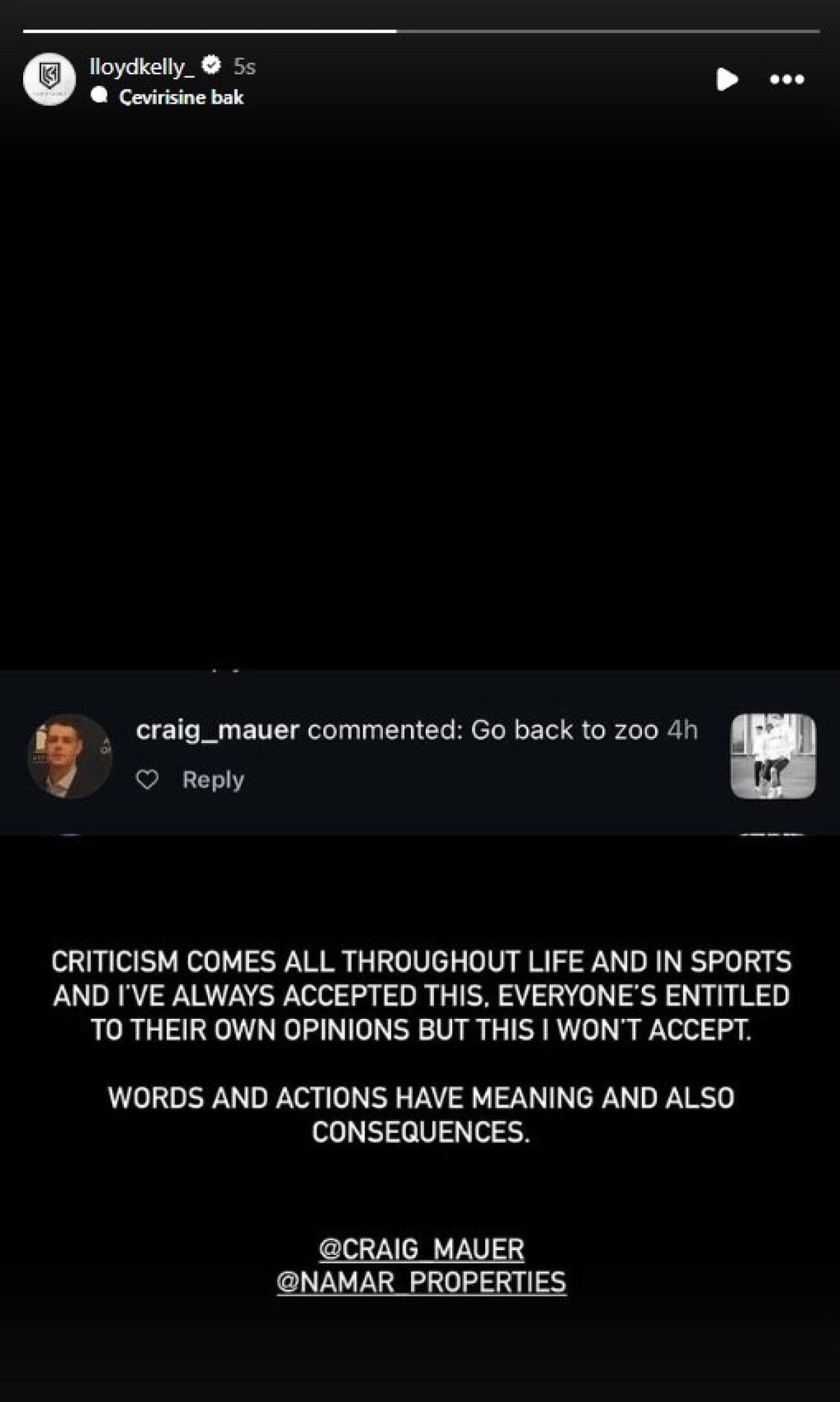 İngiliz savunma oyuncusu, sosyal medya platformu Instagram’daki hesabında bulunan bir fotoğrafının altına, kullanıcılardan birinin "Hayvanat bahçesine geri dön" yönündeki ifadenin ekran görüntüsünü paylaştı.