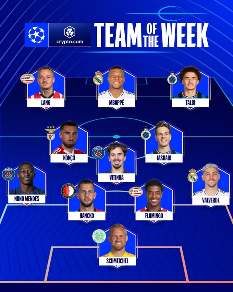 Forvet: Chemsdine Talbi (Club Brugge), Kylian Mbappe (Real Madrid), Noa Lang (PSV)
