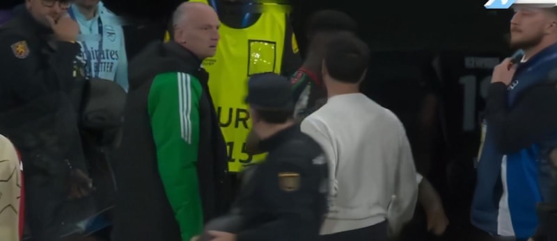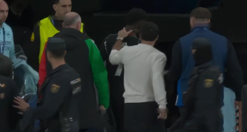 Real Madrid'in kaptanlarından Dani Carvajal sakatlığı nedeniyle maç kadrosunda olmamasına rağmen sahaya indi ve Saka'nın üzerine yürüdü.