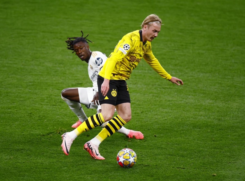 28' Karim Adeyemi topu tek başına sürdü, Real Madrid ceza sahası içinde dar açıdan topu ağlara göndermek istedi, ancak top kaleciden döndü. Füllkrug arkasına düşen topa hamle yapamadı.
