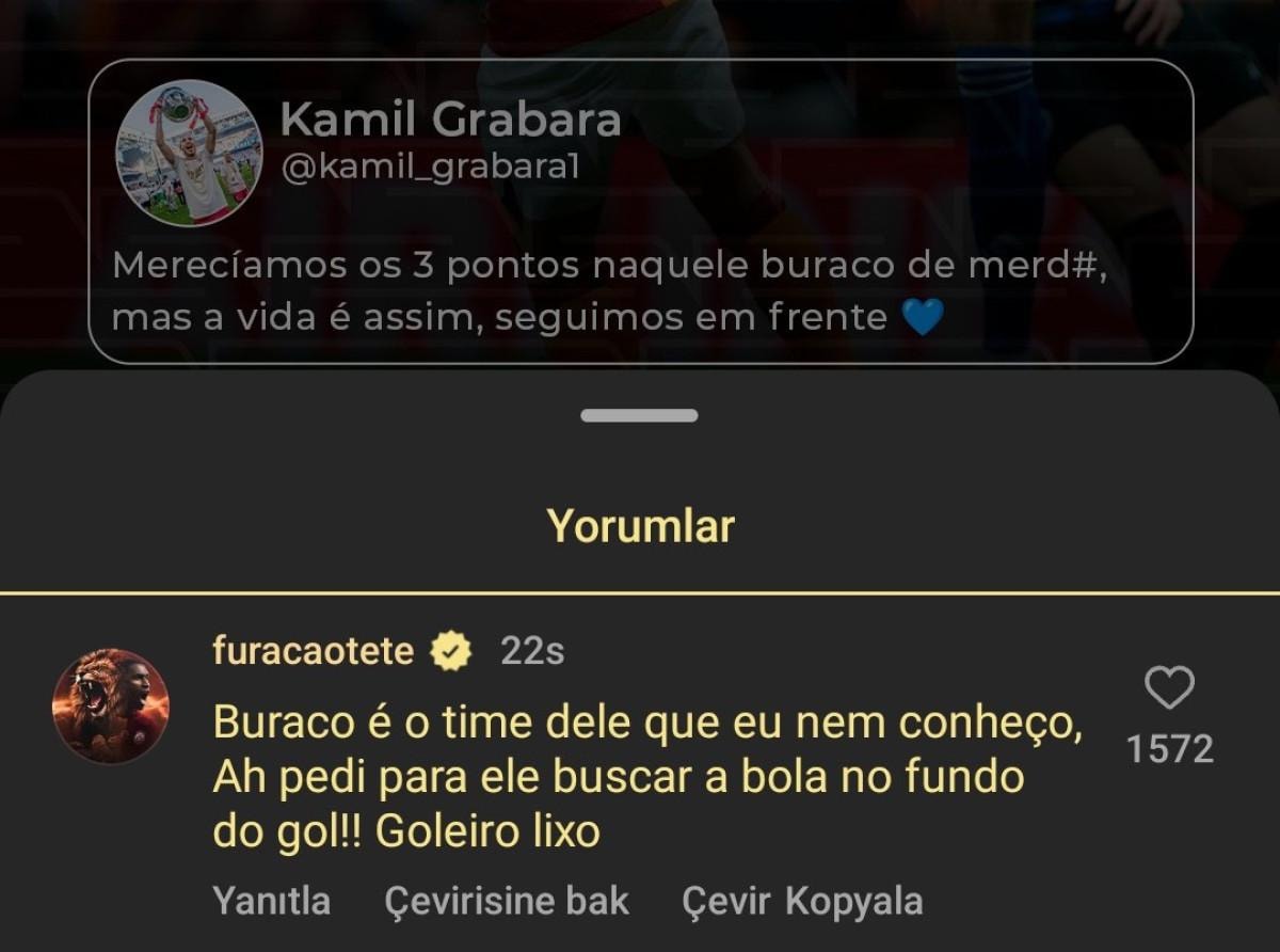 Kopenhag kalecisi Kamil Grabara'nın yaptığı tahrik edici paylaşıma Galatasaray'ın Brezilyalı oyuncusu Tete, TNT Sports Brasil Instagram hesabına yorum yaptı ve karşılık verdi.