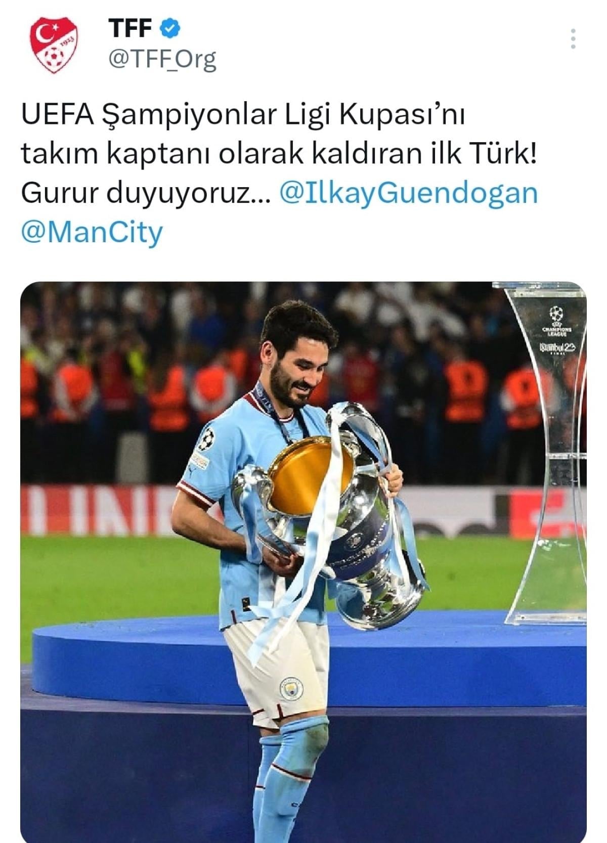 TFF, yaptığı paylaşımda "UEFA Şampiyonlar Ligi Kupası’nı takım kaptanı olarak kaldıran ilk Türk! Gurur duyuyoruz…" ifadelerini kullanarak İlkay Gündoğan ve Manchester City'yi etiketledi.