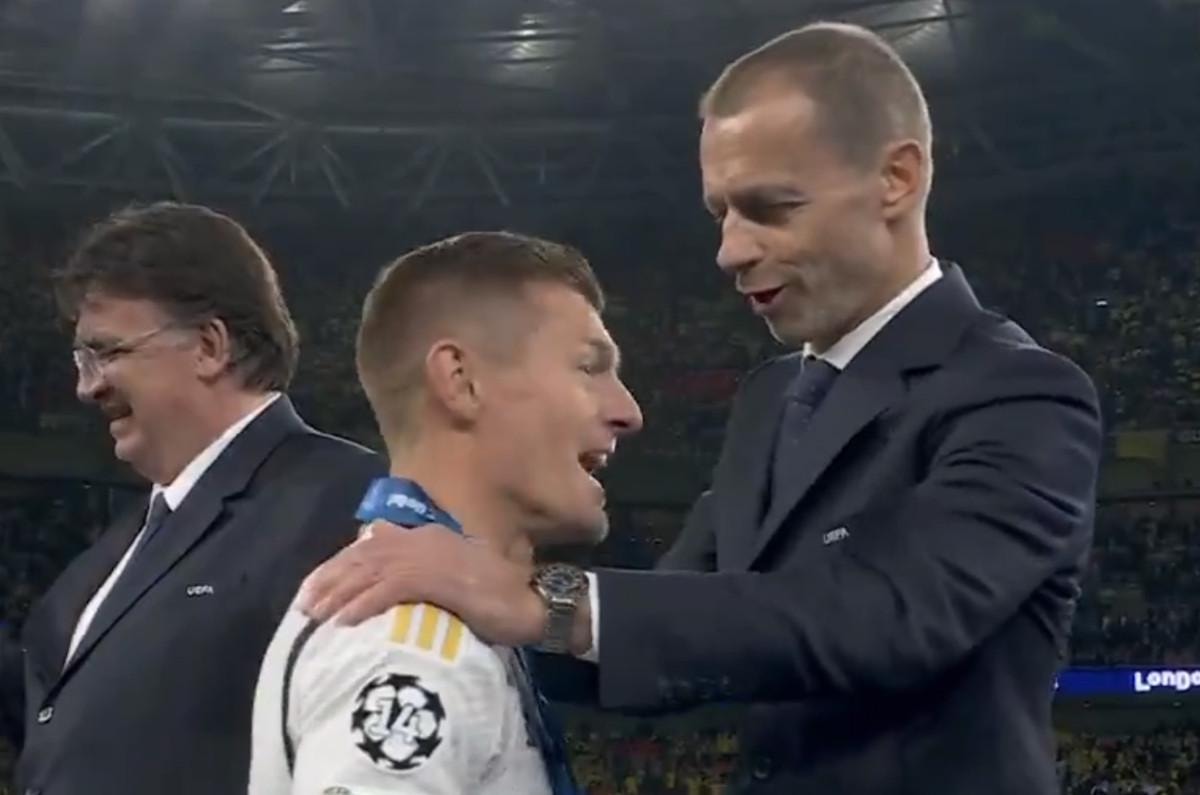 UEFA Başkanı Aleksander Ceferin, kupa töreni sırasında Kroos'tan bir yıl daha futbola devam etmesini istedi.