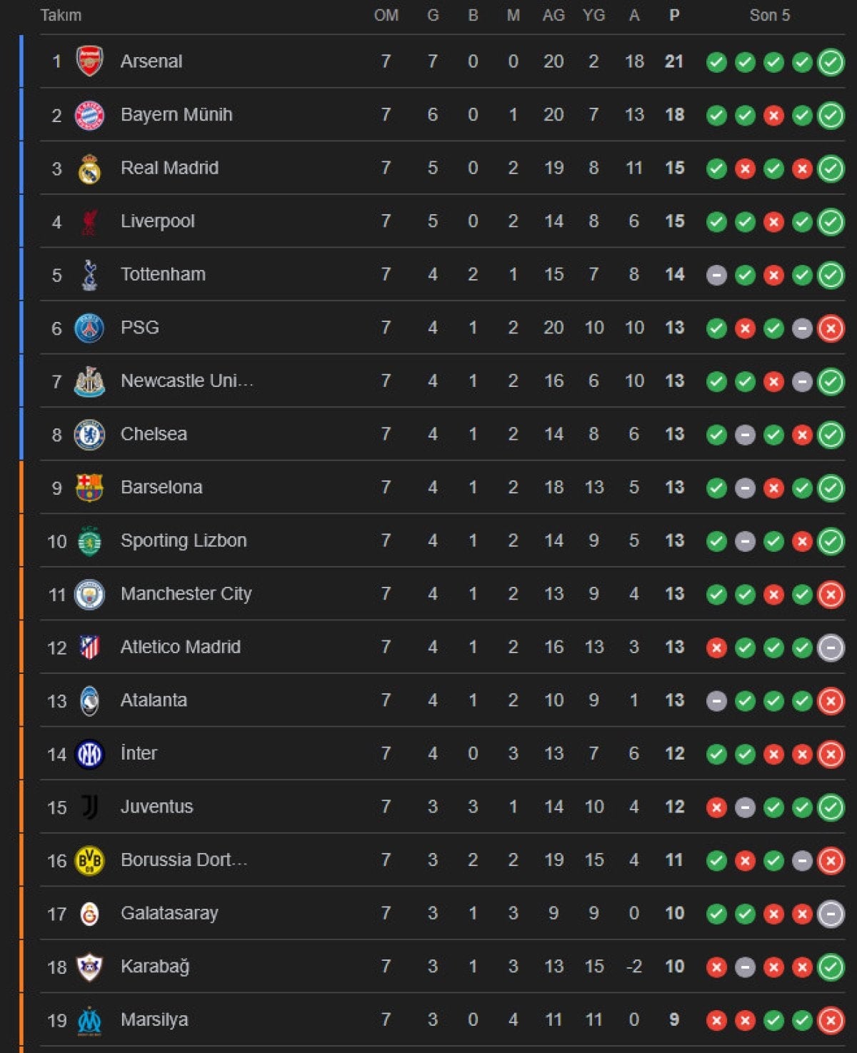 Son müsabakalar öncesi 15'er puanlı Real Madrid ve Liverpool ile 14 puana sahip Tottenham, ilk 16 sıra içerisinde yer almayı garantiledi.